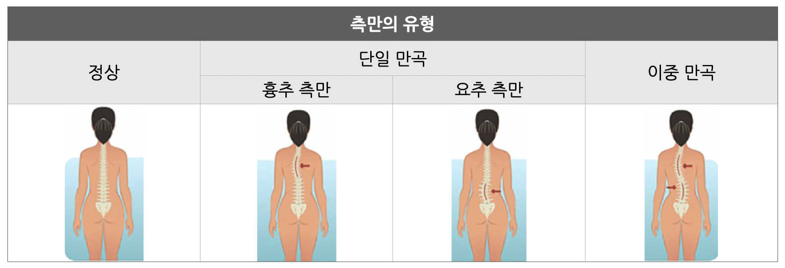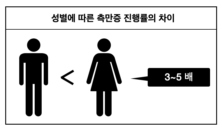척추 측만증은 유병률과 진행률에 있어 성별에 따른 차이를 보이는 질환이며, 국내외의 연구를 통해 남자보다 여자에게서 더 높은 진행률을 확인할 수 있습니다.2,3
