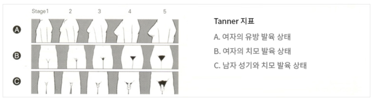 Tanner 등급은 초경 여부, 생식기 및 치모의 발육 등 이차 성징의 발달 정도를 나타낸 것으로 여성은 음모와 유방, 남성은 음모와 음경의 발달 정도에 따라 다섯 개의 등급으로 나눕니다. Tanner 지표는 방사선 촬영 없이 성장 정도를 알 수 있다는 장점이 있고 골연령과도 의미 있는 상관관계를 가지고 있습니다. 그러나 Tanner 등급을 지정하는 치모, 음경, 유방의 발달 형태에 개인차가 있다는 점에 유의해야 합니다.6